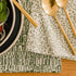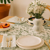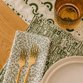 The Basilone Napkin in Cereus is responsibly printed, cut and sewn in the US on a 55% linen and 45% cotton blend with yarns from Belgium.