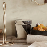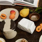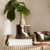 The Inlay series is a collection of stoneware that features a distinctive, two-tone mix of clays that create a large-scale, marble-like pattern – each of which is unique to the individual piece. A clear, high-gloss glazing ensures a smooth finish. This all-purpose container can be used for everything from storing dry goods in the kitchen to stationary in your home office.
