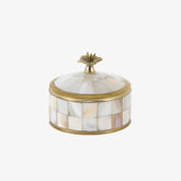 Add a touch of elegance to your space with the Maisie Circus Box Pearly. This beautifully handcrafted box showcases a radiant off-white pearly finish paired with brass accents, making it both functional and decorative.