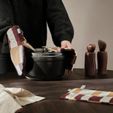 The Section Oven Mitt offers a modern reinterpretation of traditional patchwork patterns. This oven mitt features skillfully arranged coloured panels in an irregular, broken stripe layout. Made from organic cotton, it provides a soft, tactile experience. Combining functionality with contemporary style, the Section Oven Mitt offers protection and comfort when handling hot dishes.