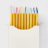 Thin and fine candles from pure beeswax with multicolored cotton wicks.