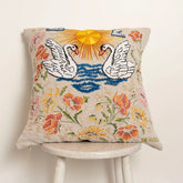 Inspired by rescued mid-century embroideries, the "Swanning Along" Pillow showcases exquisite craftsmanship with tufted swans, shimmering rope-stitched water, delicate French knots, and intricate tapestry florals. The reverse features a charming moon motif, adding a subtle touch of whimsy. Crafted from premium linen, this pillow combines vintage artistry with enduring quality, bringing a sophisticated, timeless accent to your living space.