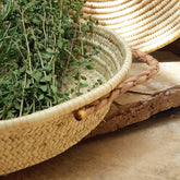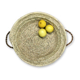 These beautiful woven trays are made of palm fibre with fine leather handles to bring a warm atmosphere to your home. They can be used as decoration and to keep your things in order. They are handmade in Marrakech, Morocco by a women's cooperative.
