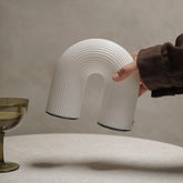 Elegant and versatile, the Vuelta Portable Lamp is a contemporary lighting piece designed for both style and convenience. Crafted from opal glass with a rippled surface, it emits a warm, diffused glow, adding ambiance to any setting. Featuring a built-in rechargeable battery and a sleek brass base, this portable lamp allows effortless placement anywhere in your home—whether on a bedside table, shelf, or outdoor setting.